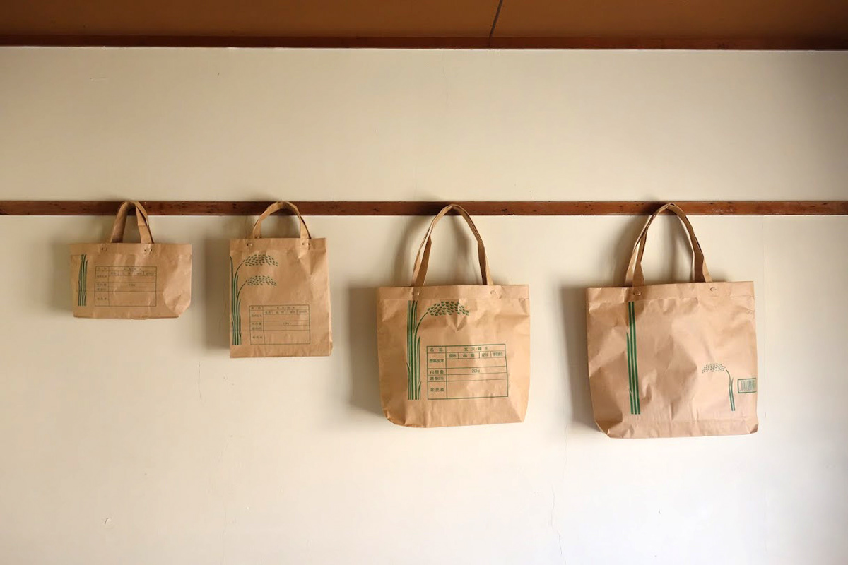 米袋はたくさんの重量の米を入れられるよう、頑丈な作りになっていることに着目し,日常でも使えるバッグの形状やアイデア,ロゴを学芸員の方,働いておられる方と共に考案した。